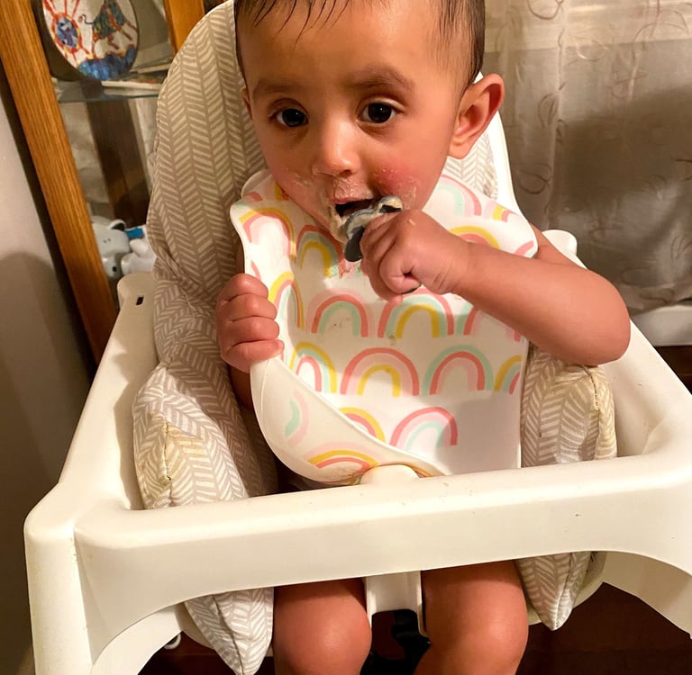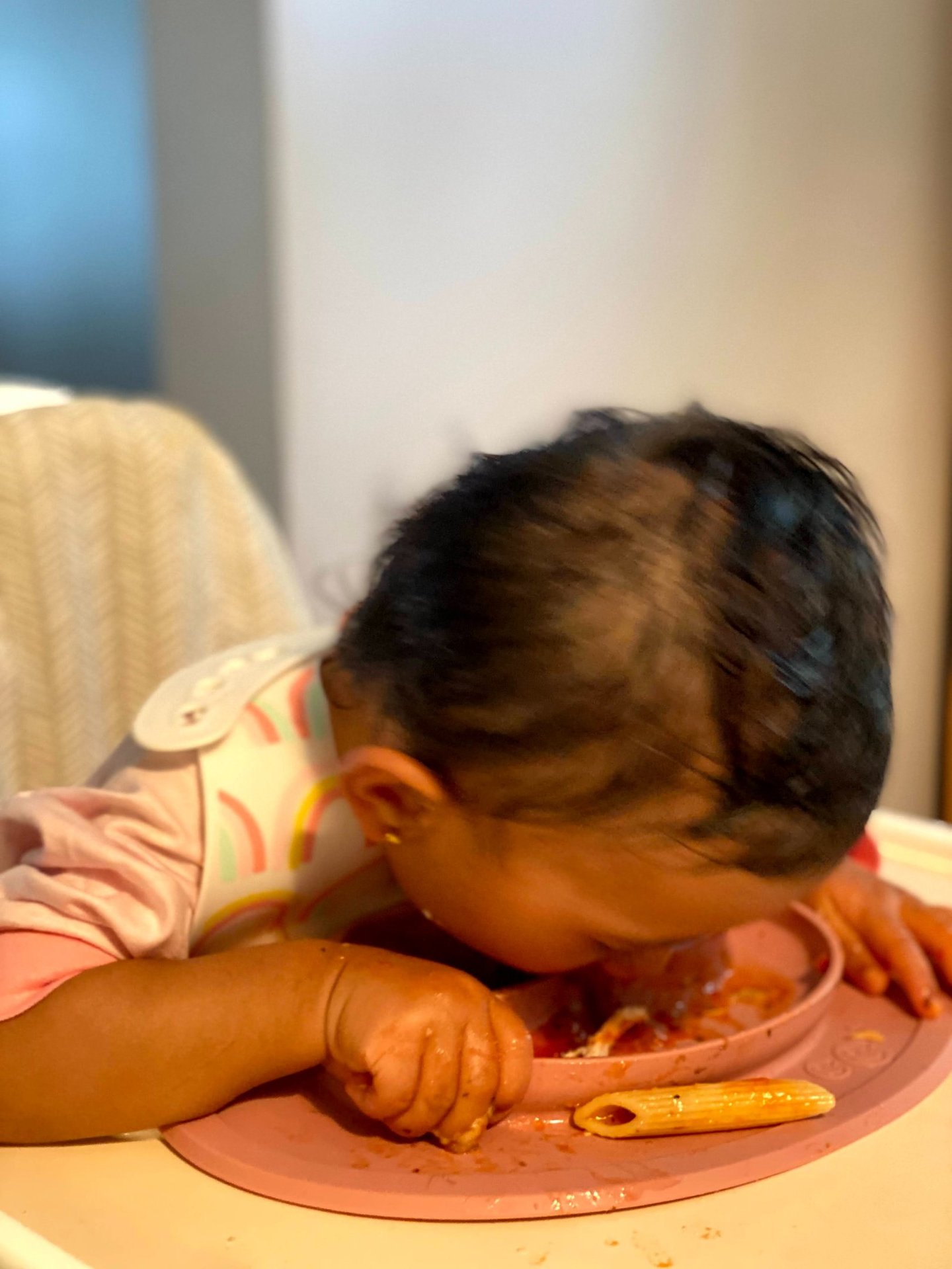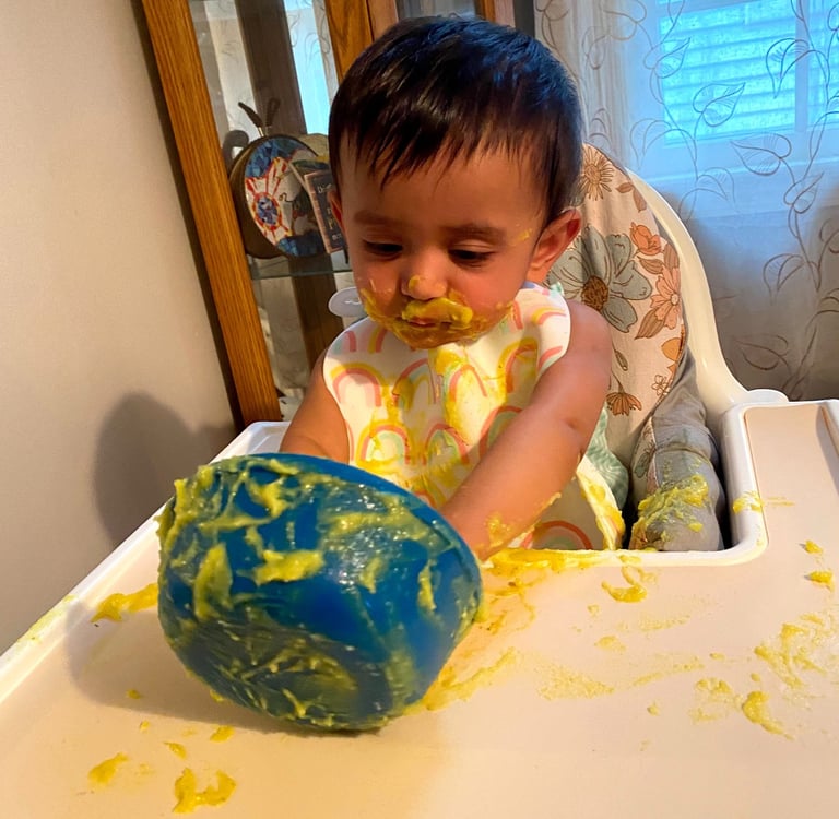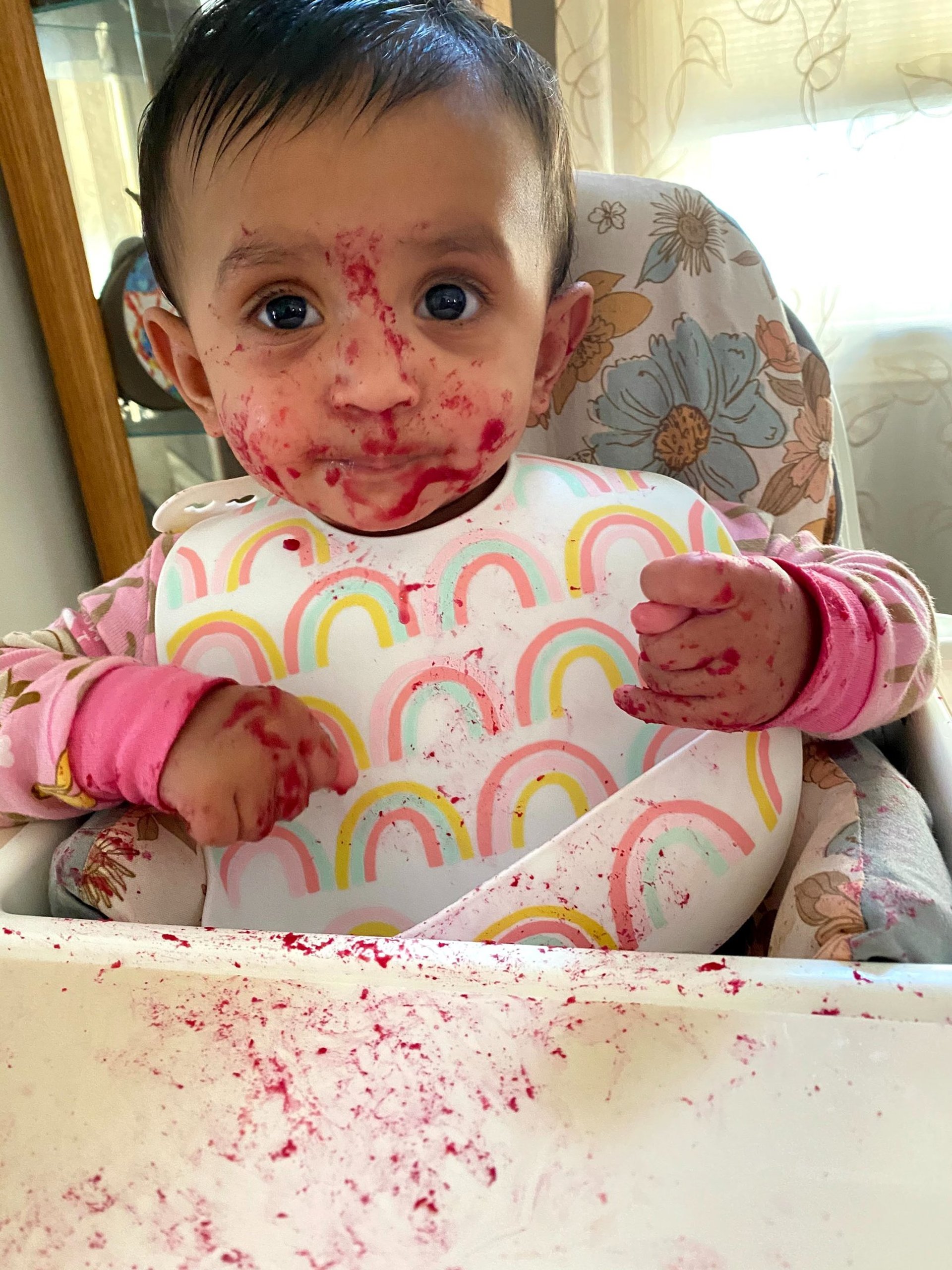 I would put her in the high chair in just a diaper so she could play with the food and get dirty. There were days I could not be bothered to undress her, and we definitely threw out more clothes than I would like to admit because the stains were so bad. But honestly it was worth it. These meals were all about exploring, tasting, and having fun. I tried to be as hands off as possible. Some days she gagged and threw up and while that was not fun to clean up it was fine because she was still learning. The funniest part was when my mom would see this. She absolutely hated it. Constantly telling me how I’m just making her throw up, she has nothing in her stomach now, she’s getting too dirty, just feed her the food to save yourself the clean up.