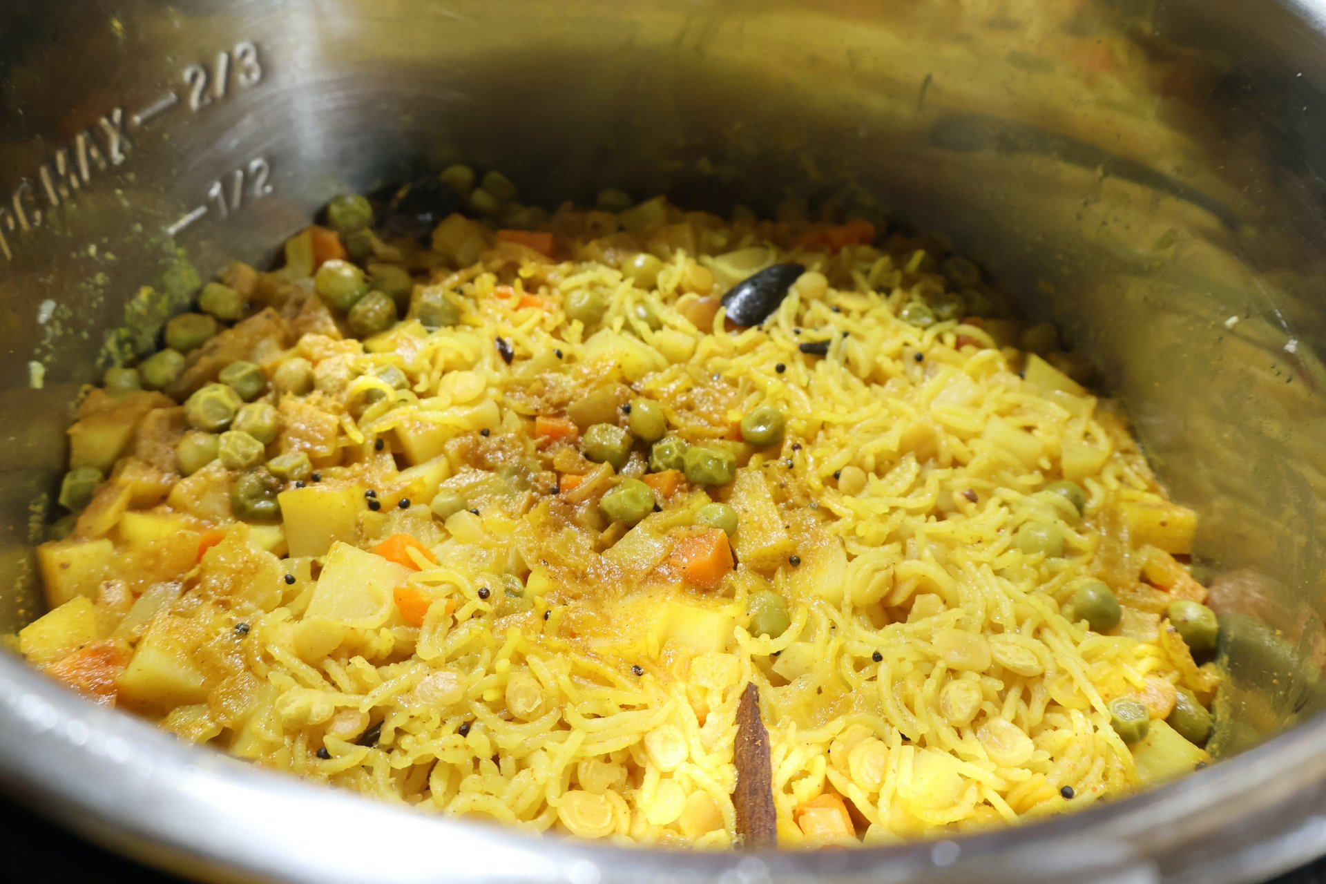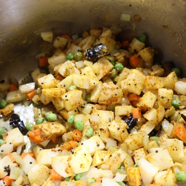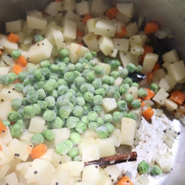 Add the potatoes, peas, and optional carrots along with the turmeric, the coriander cumin blend, the garam masala, and the red chili powder. Stir well, then add the rice, the toor dal, the salt, and the water and mix gently.