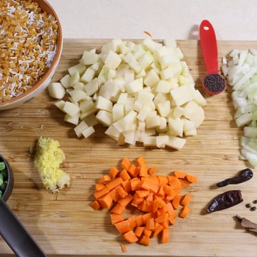 Prep the ingredients by chopping the onion, potatoes, and carrots if you are using them, and grate the garlic and ginger.